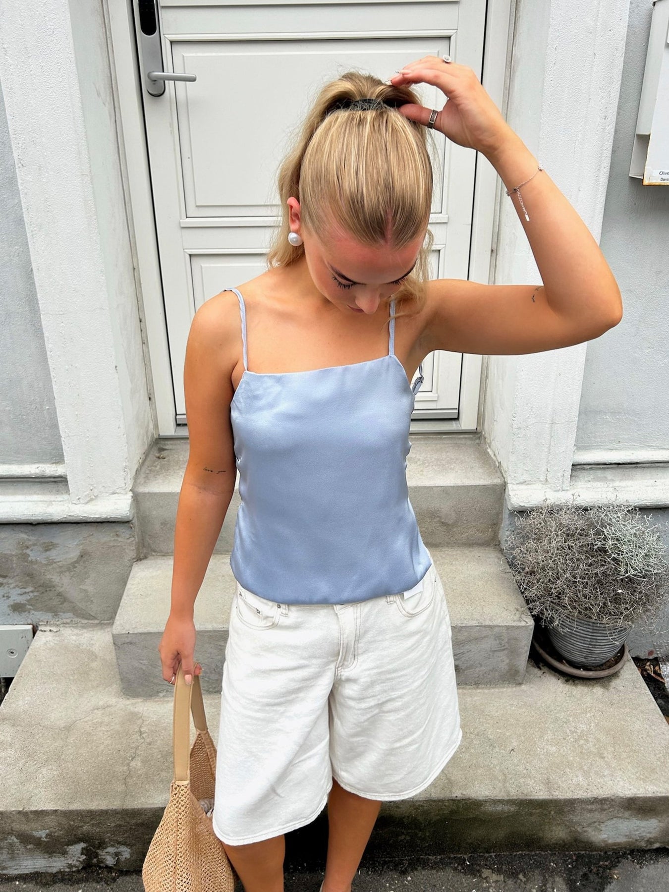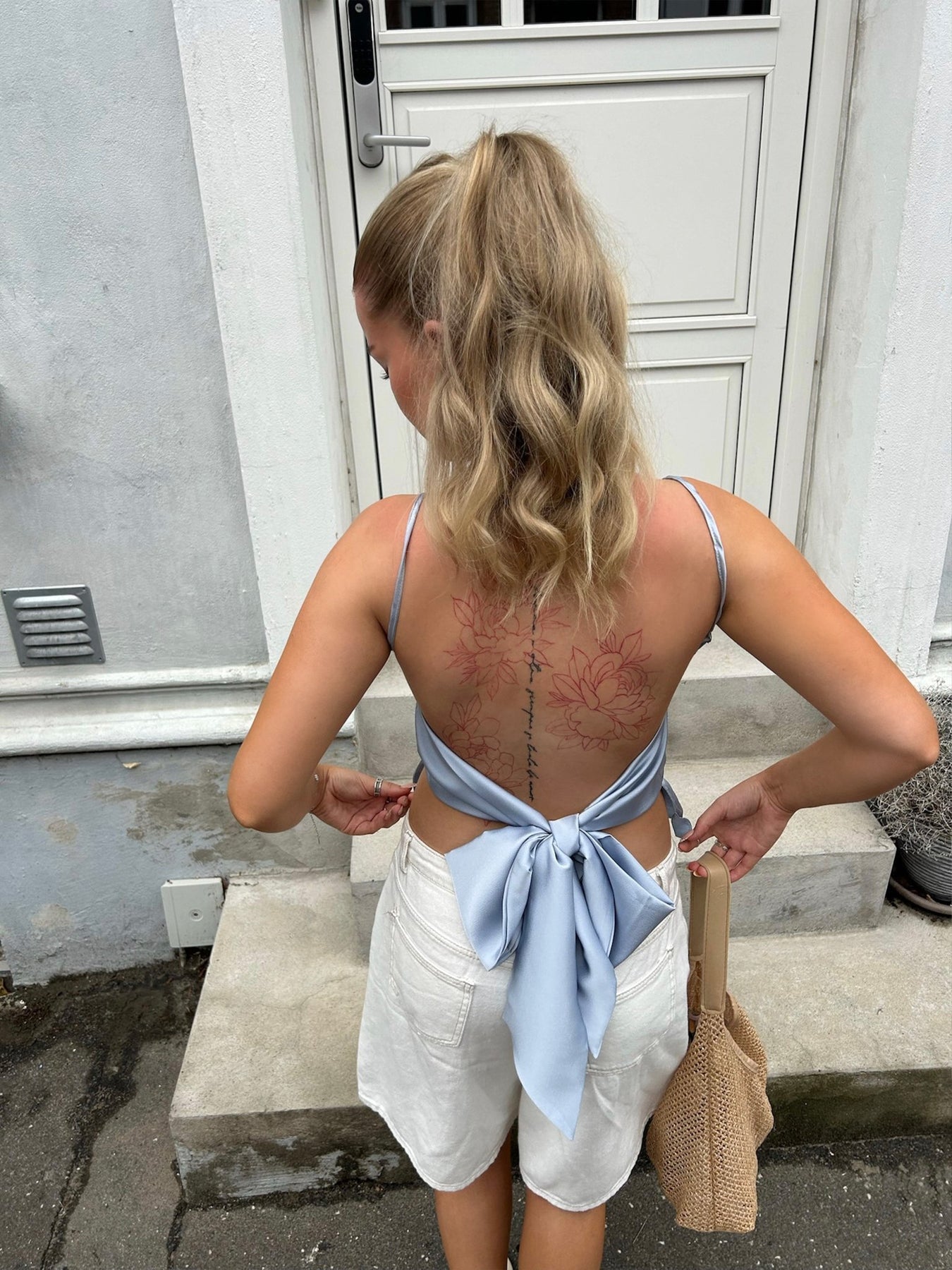 Den fineste lille top til sommerens varme dage. Den bløde, skinnende kvalitet falder smukt, mens den firkantede halsudskæring giver et enkelt og elegant look. Bagpå åbner toppen op i en lav ryg med en stor, feminin sløjfe, der binder det hele sammen – bogstaveligt talt.