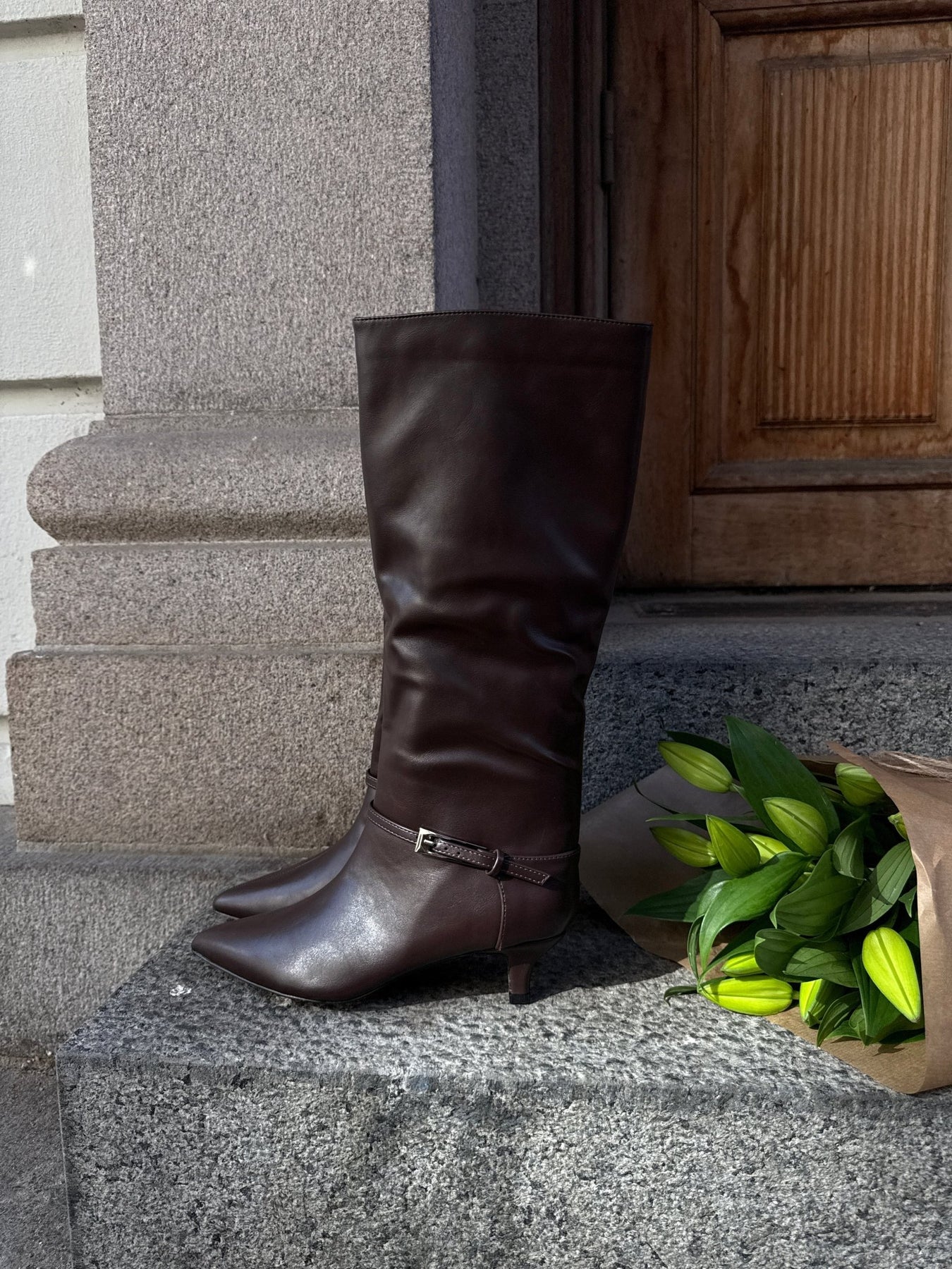 Tilføj et strejf af klassisk elegance til din garderobe med disse smukke knæhøje støvler i mørkebrunt læderlook.