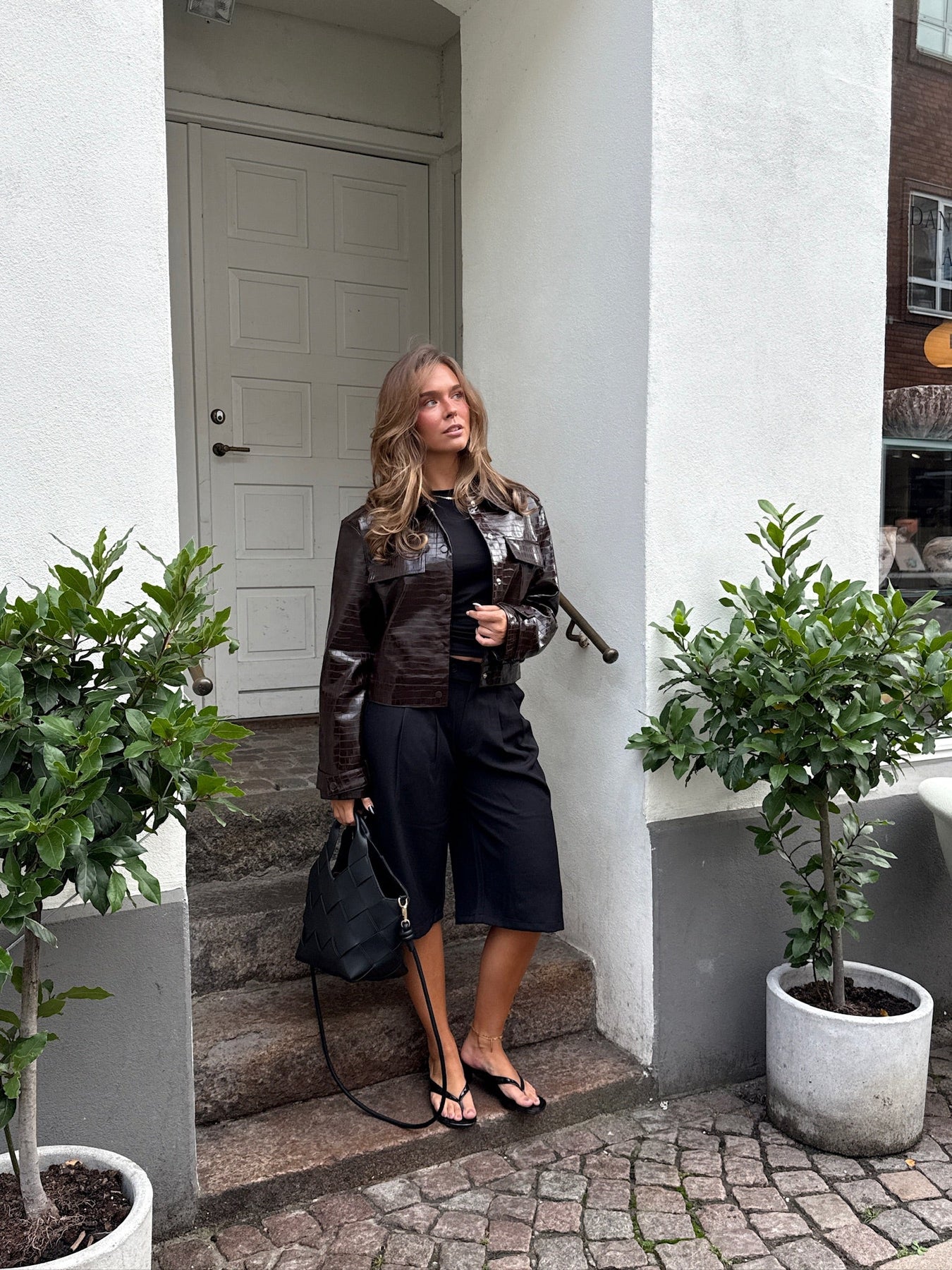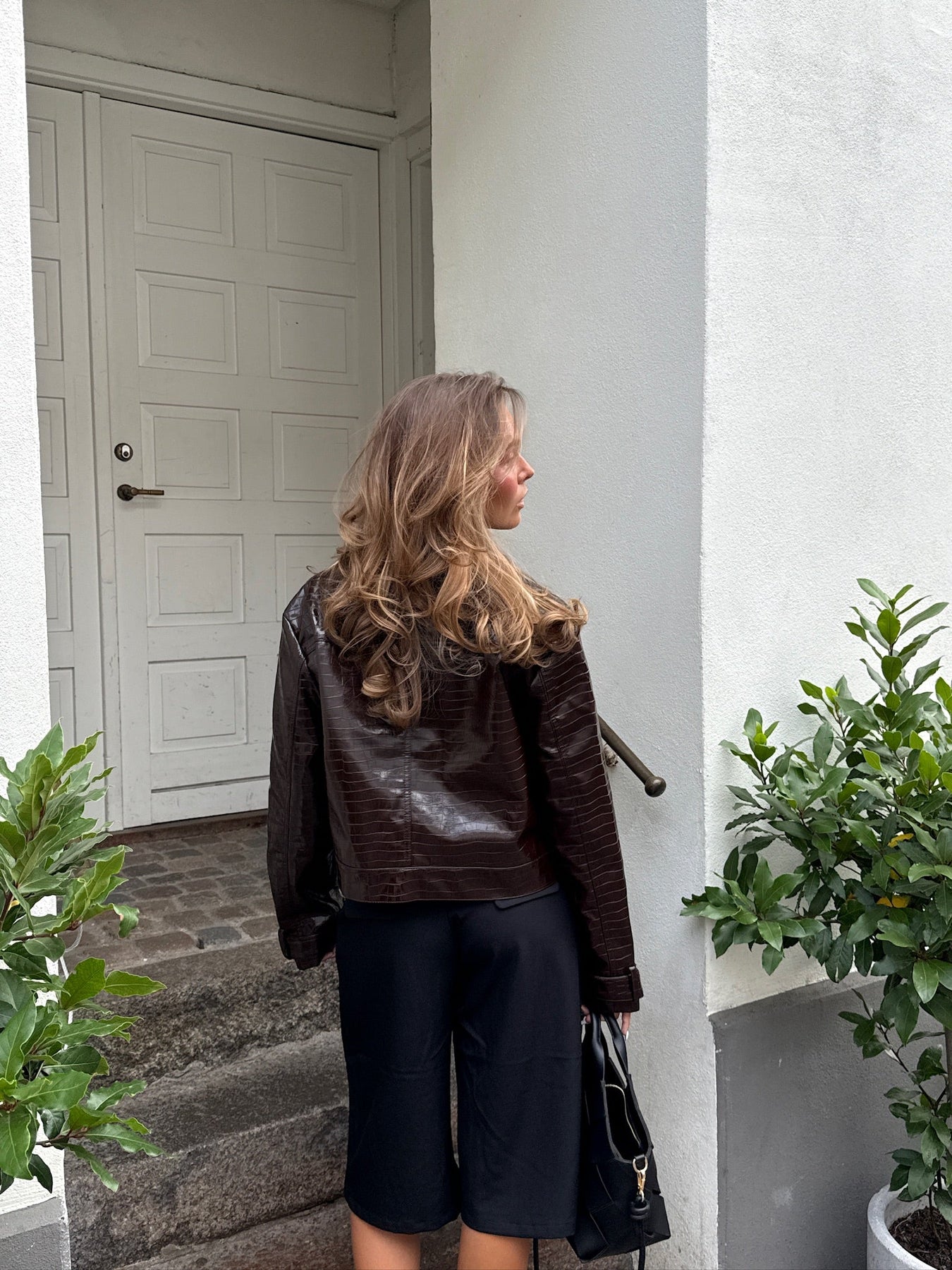 Den korte og boxy pasform skaber en cool kontrast til det blanke finish, og gør jakken ideel til både hverdagsbrug og aftenstyling.