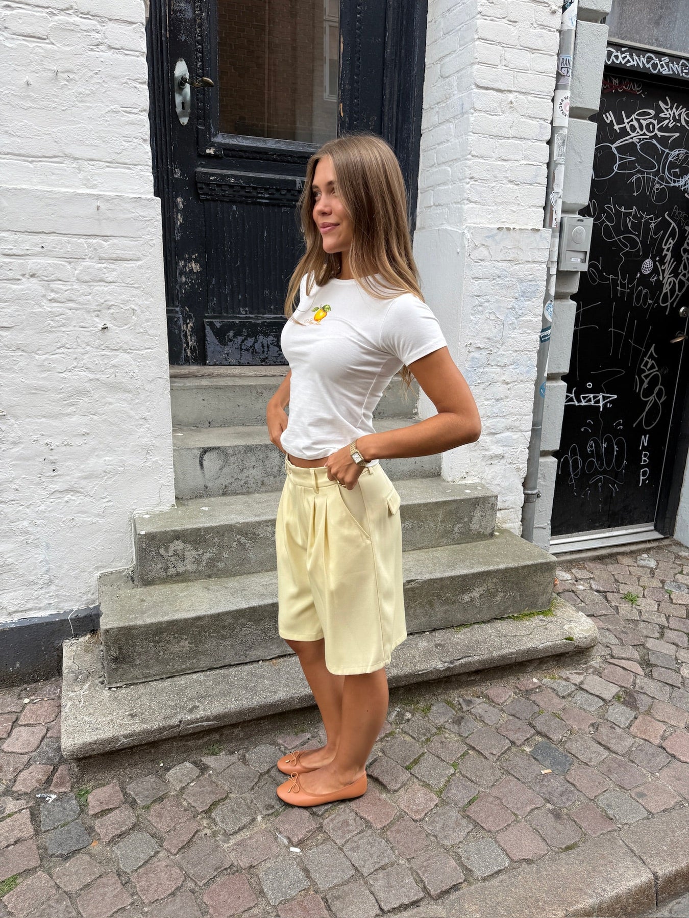 Disse butter lysegule shorts har en afslappet, men struktureret pasform med læg foran, bæltestropper og en klassisk knaplukning. De er lavet i et let og luftigt materiale, der falder flot og gør dem super behagelige at have på – også på varme dage.