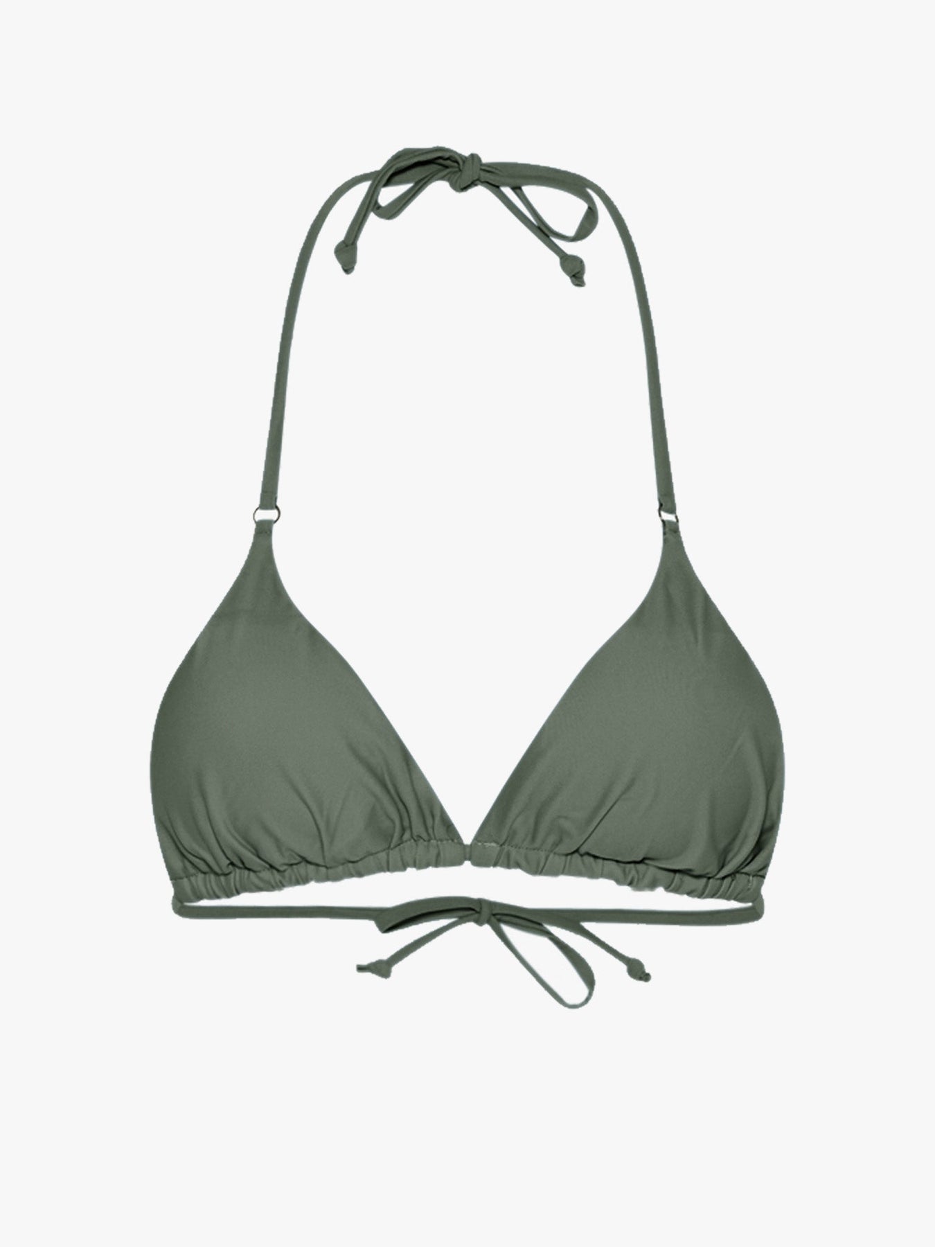 Nora Bikini har et trekantsdesign med snører der bindes bagpå og i nakken. Bikinien har små sølvringe som detalje. Overdelens dækkeevne kan reguleres langs rynkekanten.