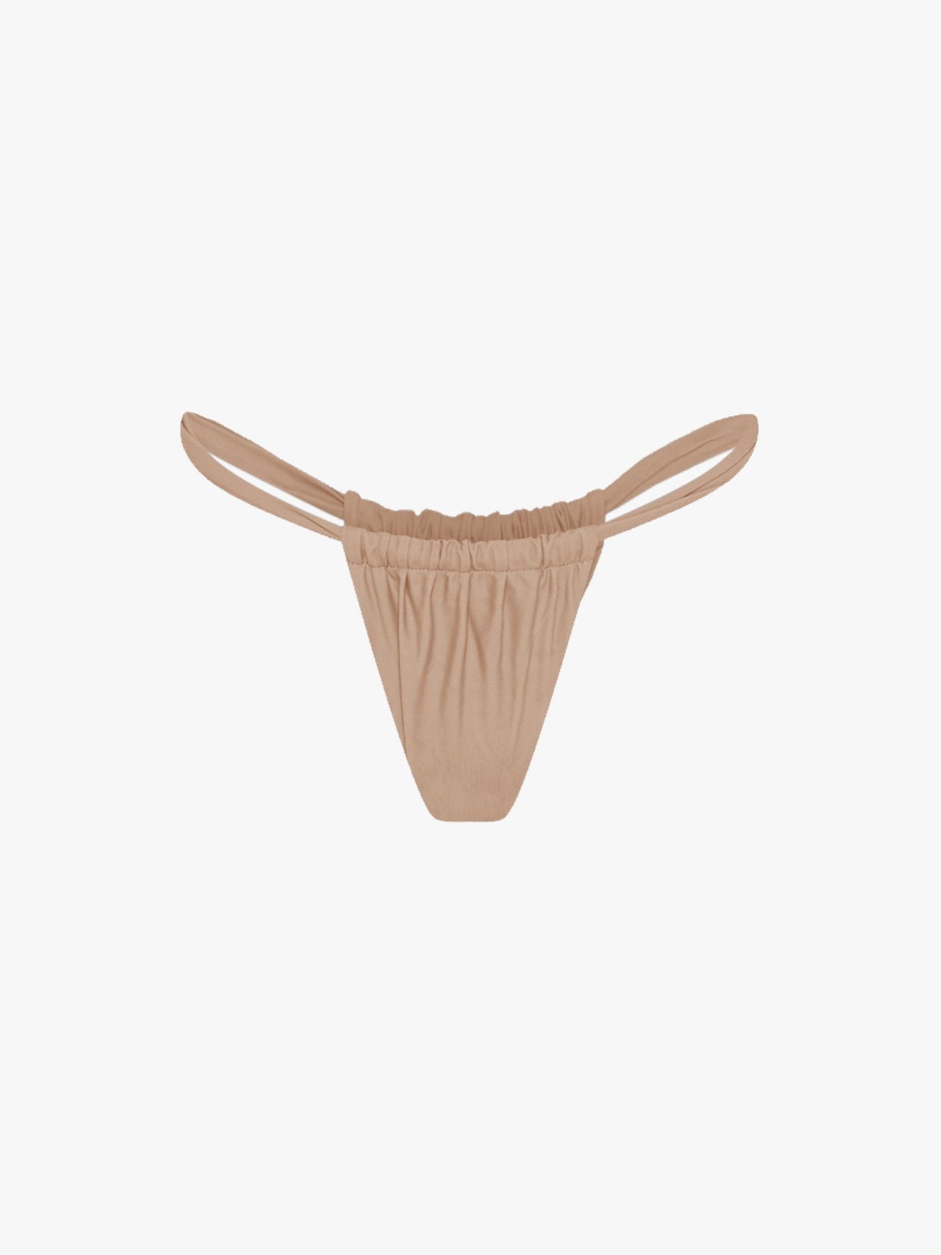 Nora Bikini har et trekantsdesign med snører der bindes bagpå og i nakken. Bikinien har små sølvringe som detalje. Overdelens dækkeevne kan reguleres langs rynkekanten.