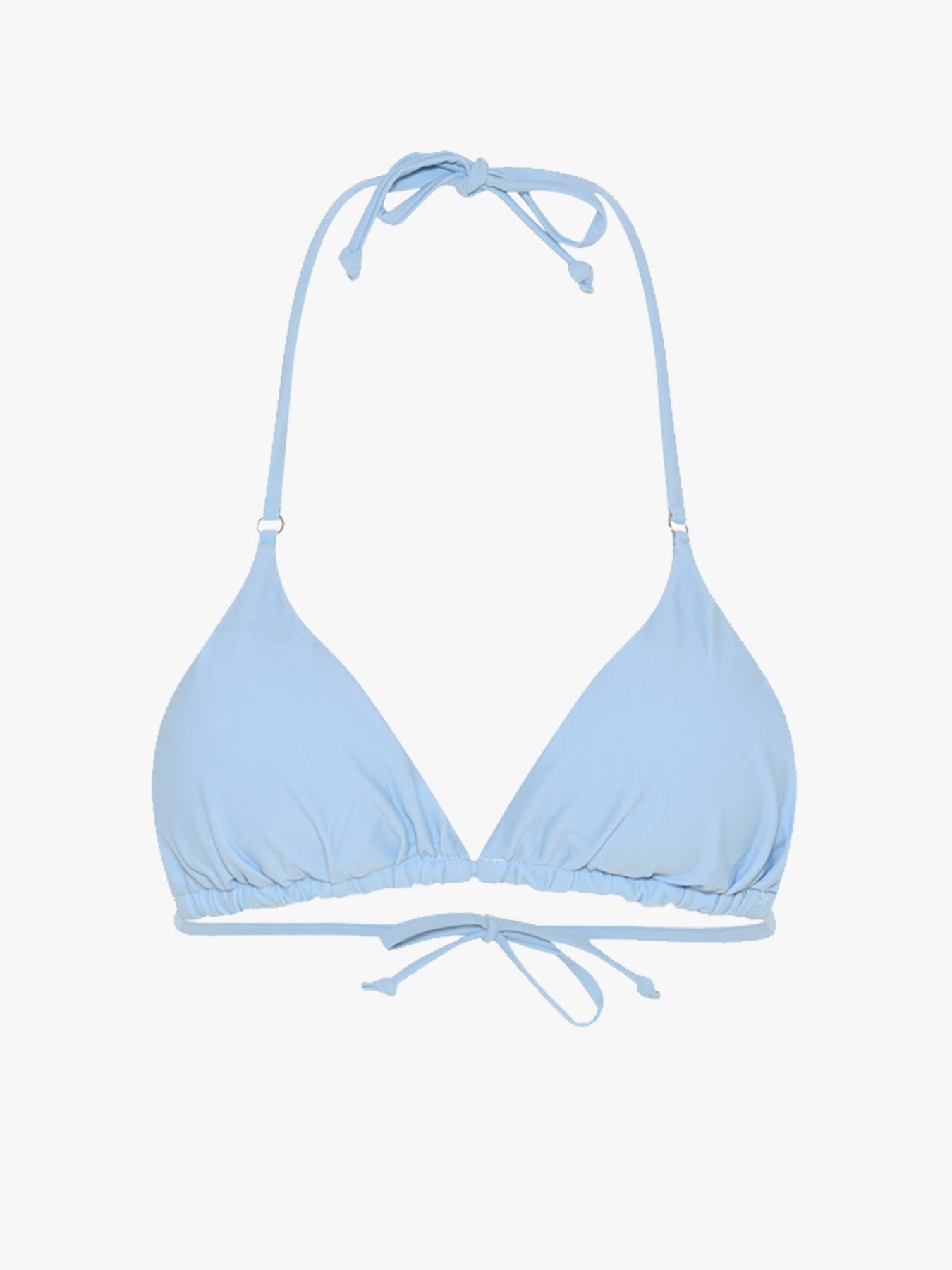Nora Bikini har et trekantsdesign med snører der bindes bagpå og i nakken. Bikinien har små sølvringe som detalje. Overdelens dækkeevne kan reguleres langs rynkekanten.