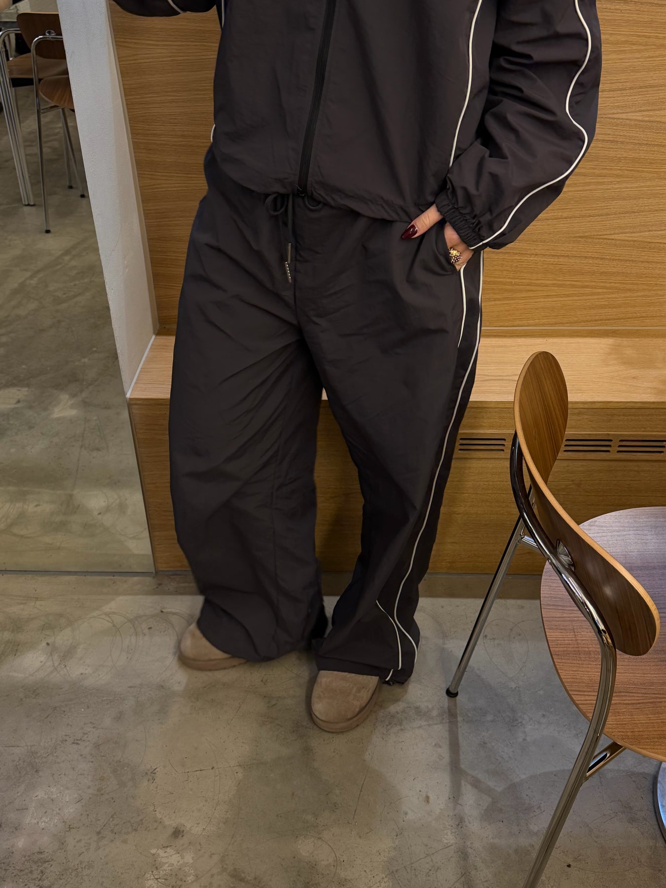 De gennemgående detaljer langs benene skaber et sporty og sammenhængende design. Der findes en matchende jakke, som fuldender sættet og giver mulighed for et gennemført tracksuit-look, men bukserne fungerer også perfekt stylet alene med andre overdele.