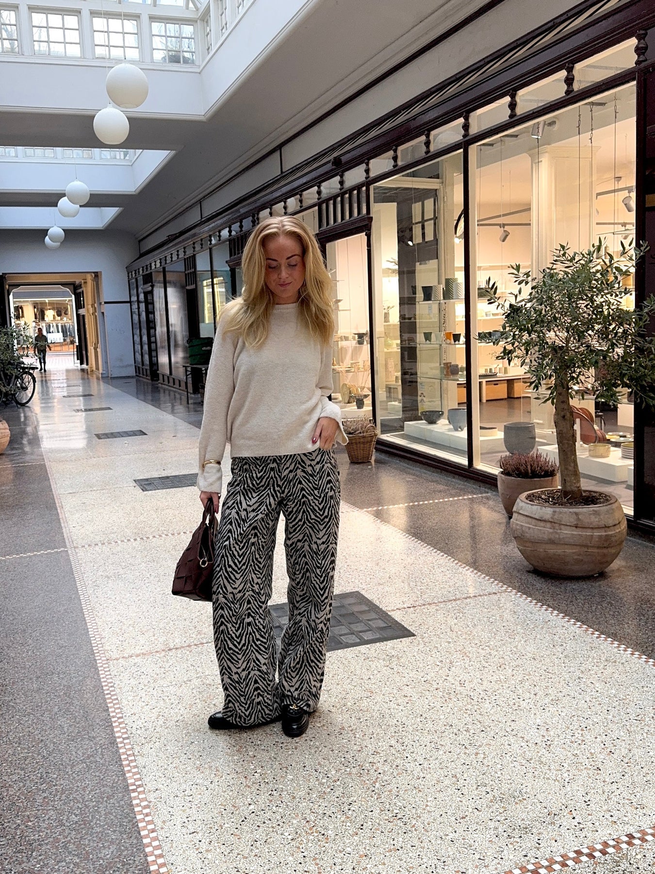 Disse jeans i zebra print er den perfekte kombination af stil og komfort! Med et fedt mønster, der virkelig skiller sig ud, får du et råt og unikt look. De er lavet i et blødt og stretchy materiale, der sidder perfekt og giver masser af bevægelsesfrihed. Perfekte til at pifte en simpel t-shirt op eller til at sætte et cool twist på din outfit.