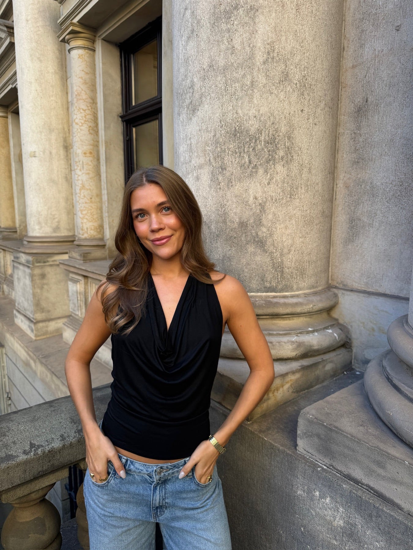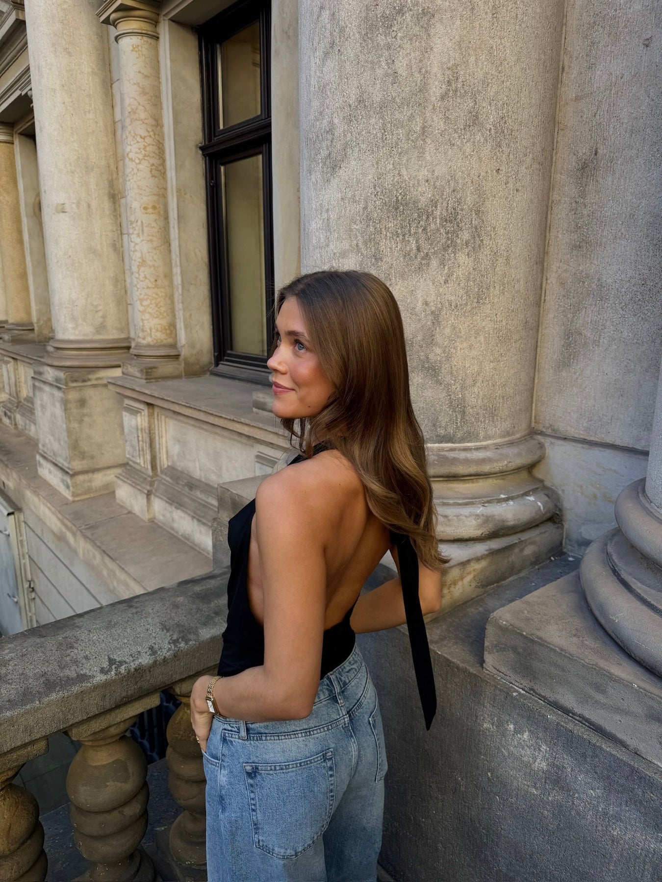 Denne stilfulde halterneck-top kombinerer et flatterende frontdesign med en elegant, åben ryg, der bindes i nakken for et justerbart og feminint fit. Den tætsiddende pasform fremhæver taljen, mens det lette, bløde materiale giver både komfort og et eksklusivt fald. Toppen er perfekt til både hverdag og aftenbrug – style den med jeans for et casual look eller med en nederdel til festlige lejligheder.