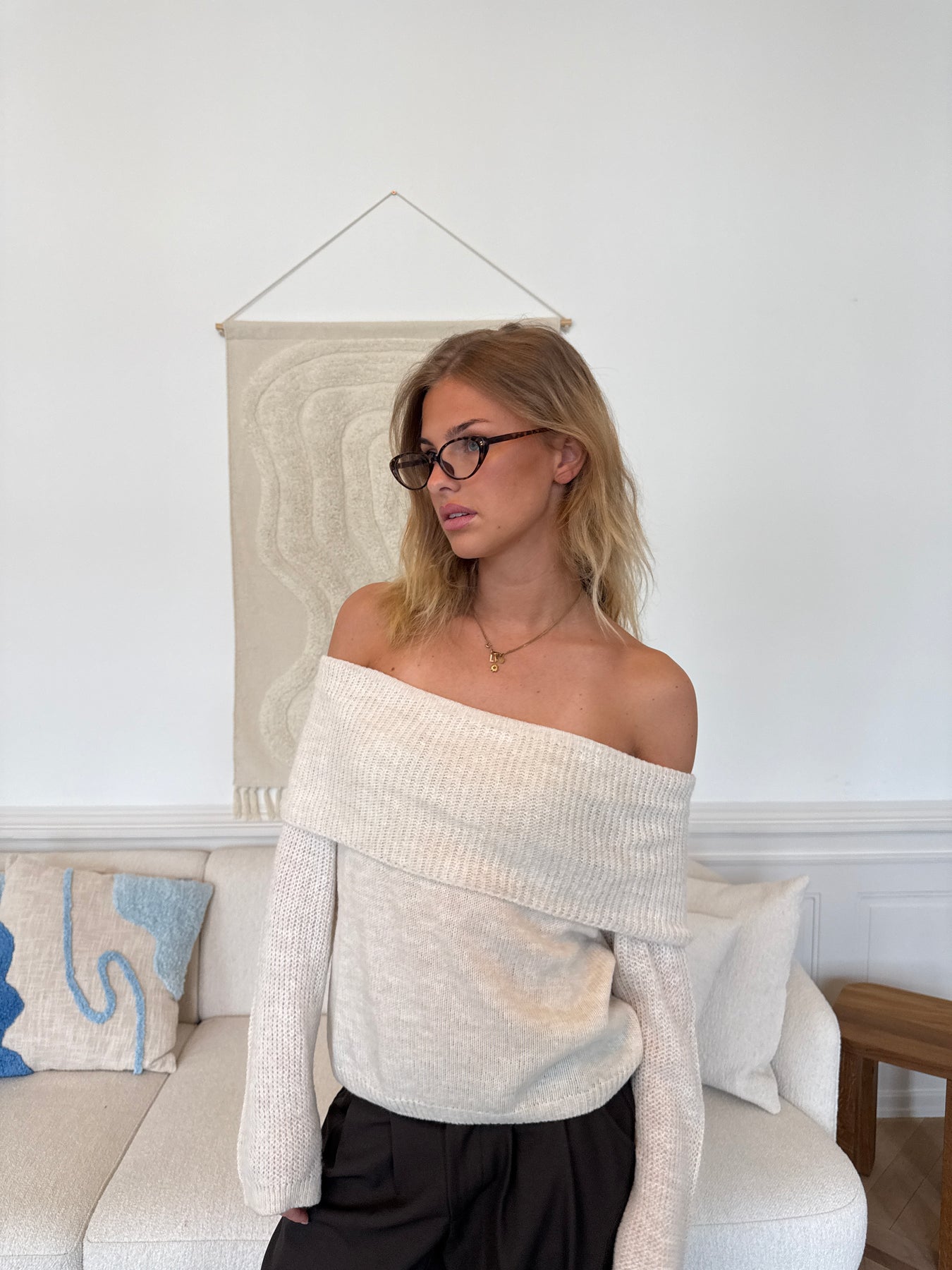 Tilføj et afslappet, men stilfuldt element til din garderobe med vores bløde off shoulder knit. Denne trøje er perfekt til hverdagsbrug og kan let styles til både afslappede og mere festlige anledninger.
