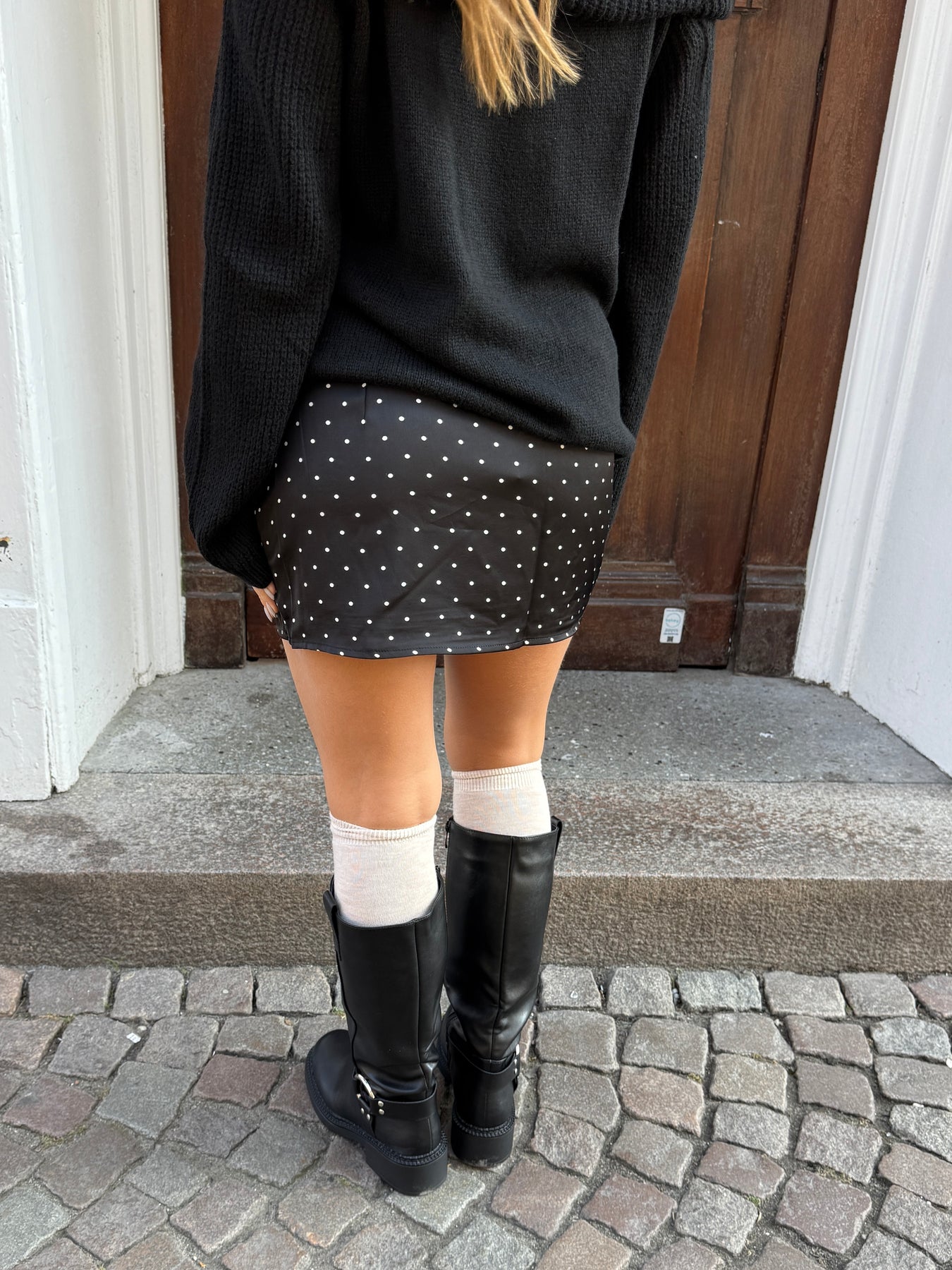 Denne smukke mini-nederdel med prikker er en feminin klassiker, der passer perfekt til både hverdag og mere festlige anledninger. Det glatte materiale falder flot og giver nederdelen et elegant udtryk, mens det tidløse prikkede mønster tilfører et legende twist.