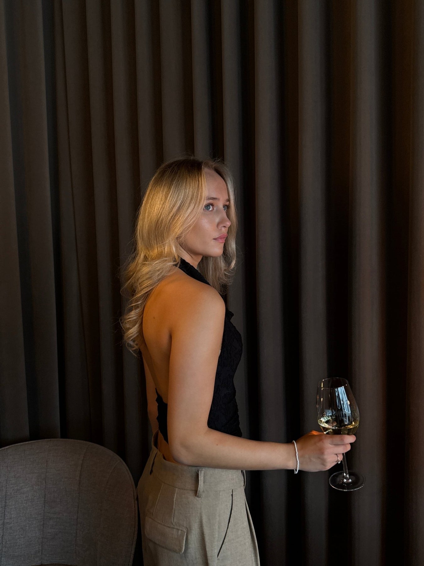 Den tætsiddende pasform kombineret med det strækbare materiale giver både komfort og en smuk form. Den åbne ryg og halterneck-design gør toppen ideel til varme dage eller som et stilfuldt lag under en blazer.