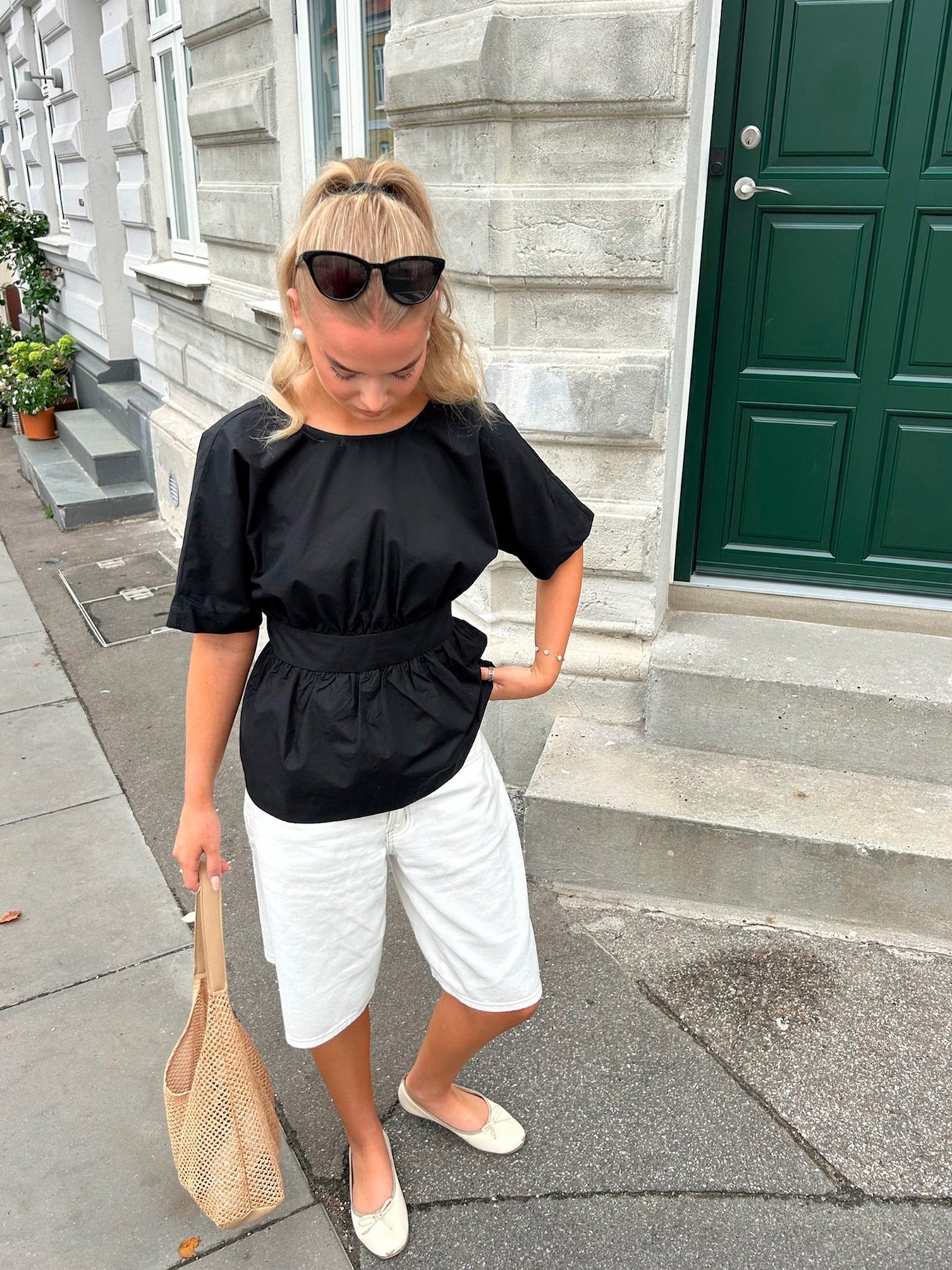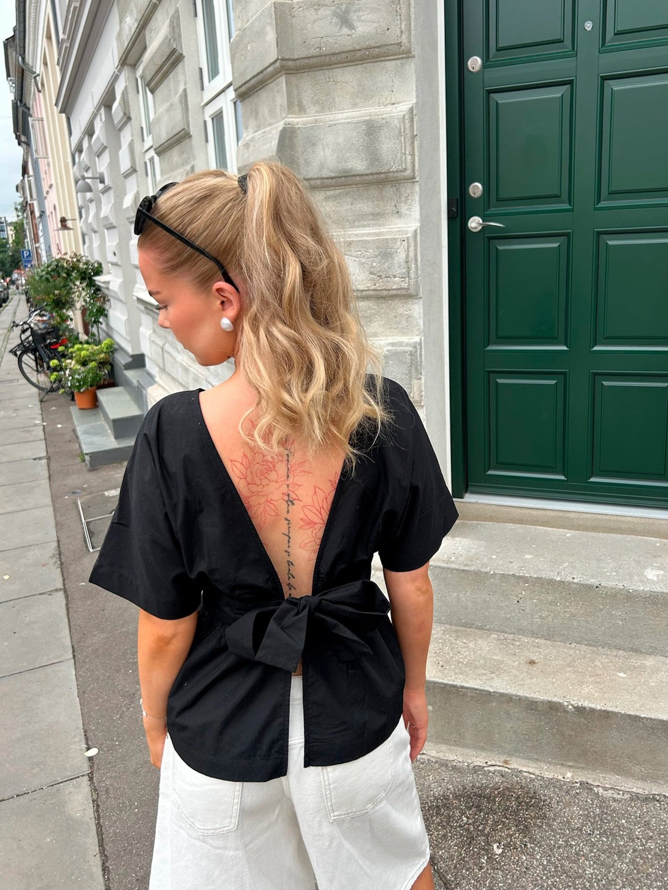 Enkel foran – overraskende bagpå. Denne top har et klassisk snit med rund hals og korte ærmer, mens ryggen er åben og bindes med en stor, feminin sløjfe i taljen. Det bløde materiale og den let markerede talje giver en flatterende pasform og en behagelig fornemmelse.