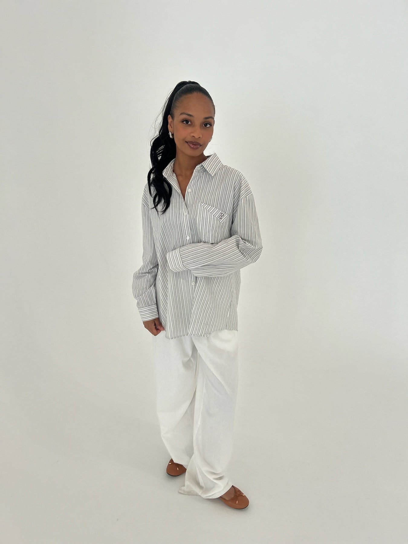 En afslappet og stilren skjorte med klassiske striber og en rummelig pasform. Det enkle design kombineret med diskrete detaljer som brystlomme og knaplukning gør den til et alsidigt item, der kan styles både åbent og lukket.