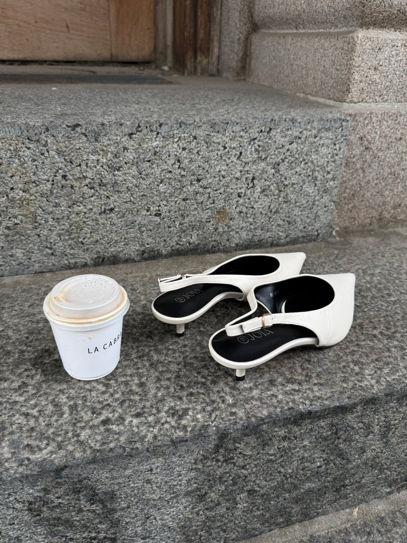 Thyra Slingback er en elegant stilet med spids snude og lav stilethæl. Skoen er udført i en ensfarvet, cremefarvet overflade med let glans, hvilket giver et rent og minimalistisk udtryk.