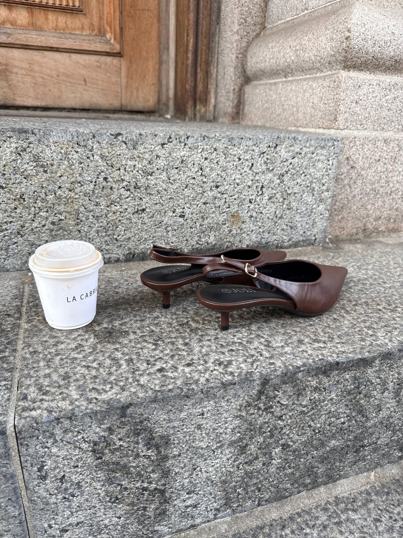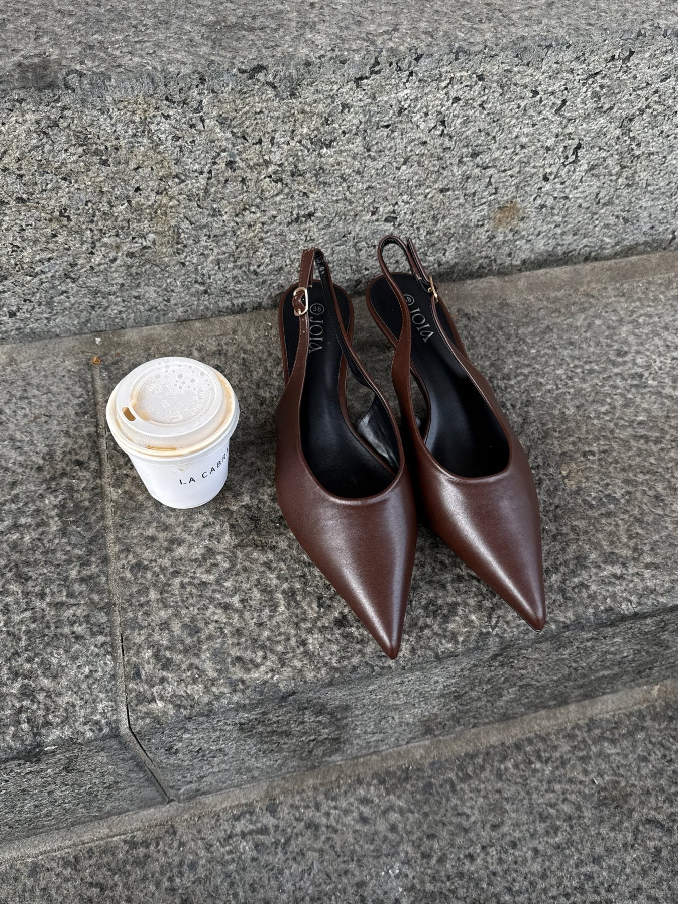 Thyra Slingback er en elegant stilet med spids snude og lav stilethæl. Skoen er udført i en ensfarvet, mørkebrun overflade med let glans, hvilket giver et rent og minimalistisk udtryk.