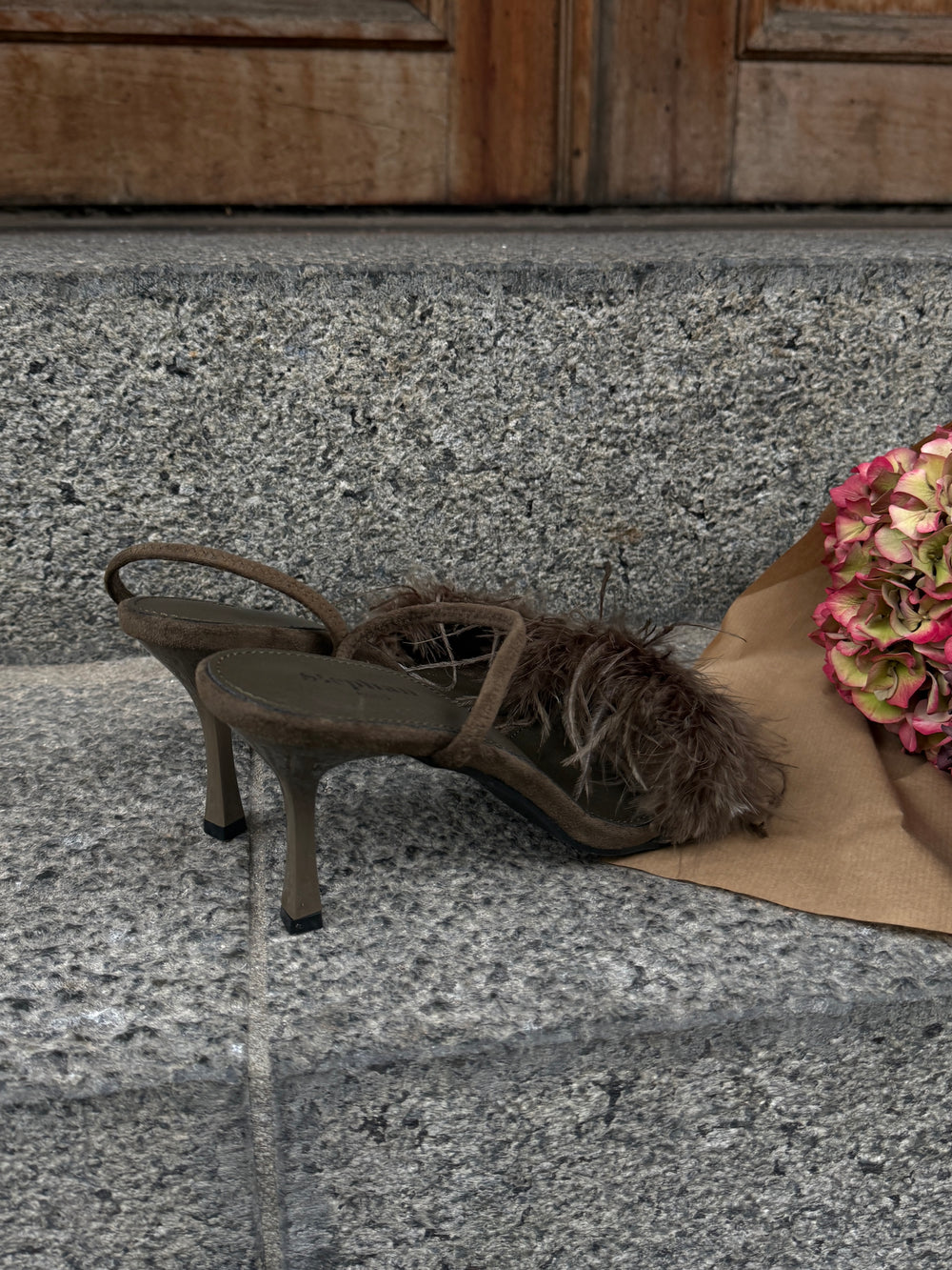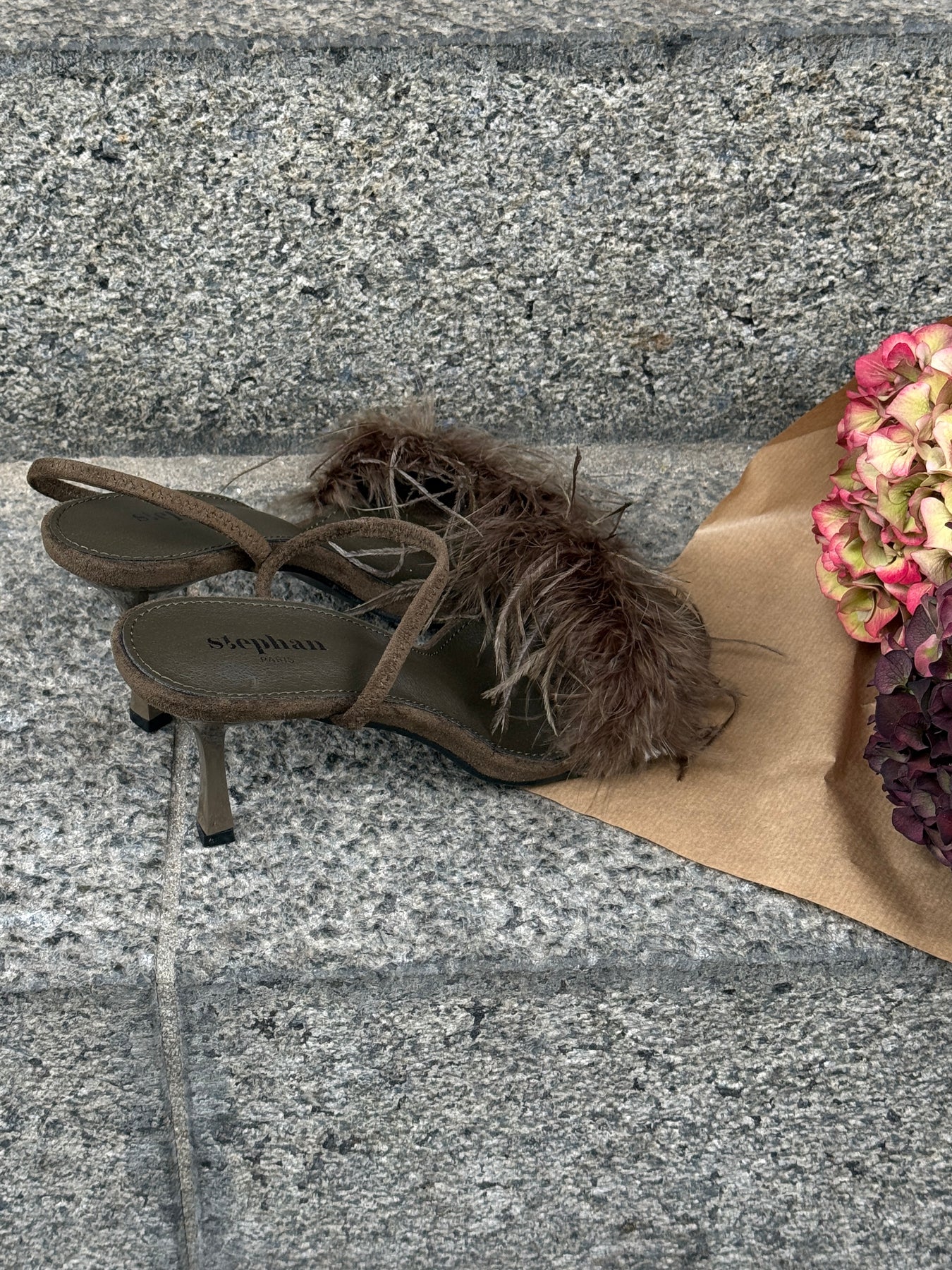 Skoen er designet i et sofistikeret khaki look med en iøjnefaldende, blød fjerdetalje på fronten, som skaber et glamourøst og trendy udtryk. Med slank hæl og elegant slingback-rem giver skoen både visuel lethed og komfortabel støtte